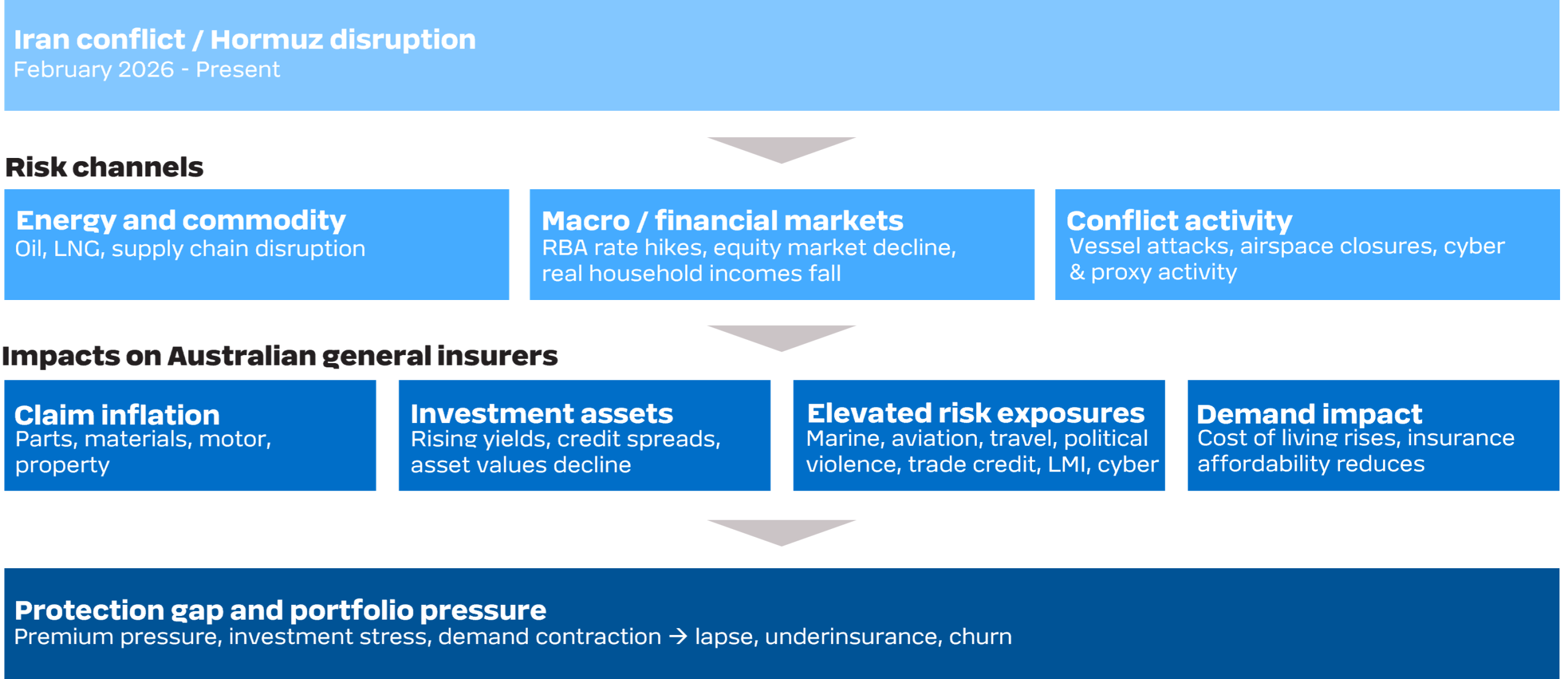 The conflict flows through three risk channels – each generating distinct impacts on Australian general insurers. The figure illustrates the interplay between these risks and the impacts on general insurers.